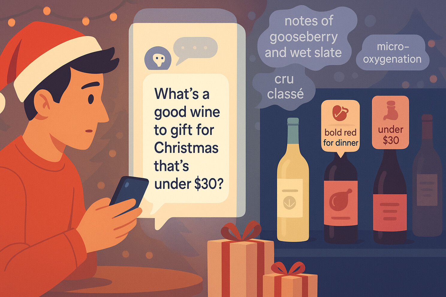The wine industry’s tendency to cling to inaccessible language, if not mitigated, will likely result in a similar issue for generative AI (gen AI) tools. Using inaccessible language to describe products, wine tastings, or wine excursions risks limiting brand discovery due to a mismatch between user prompts (the language users actually use to request recommendations). The growing use of AI chatbots for product discovery will force wine brands to empathize with holiday guests or wine-curious individuals who lack an extensive wine vocabulary. These average users may be more inclined to prompt Google’s Gemini or OpenAI’s ChatGPT with the question, “What’s a good wine to gift for Christmas that’s under $30?”