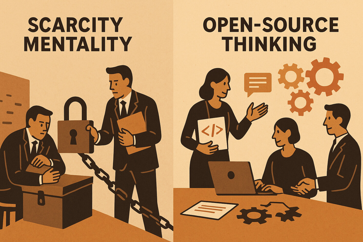 In business, the “scarcity mentality” has long kept companies focused on hoarding their intellectual property and competing fiercely. However, the rise of open-source thinking is shifting this paradigm. Much like the digital commons and open-source software, businesses can now benefit from shared resources, collaborative knowledge, and transparent, open development processes.